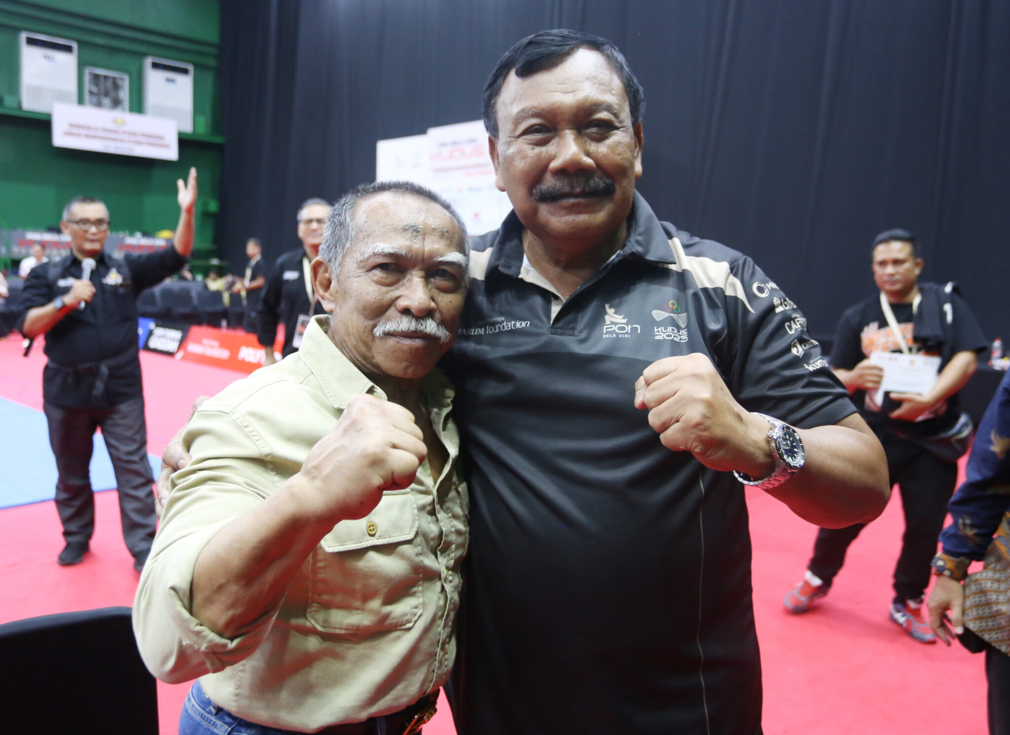 Ketua Pelaksana PON Bela Diri/2025 Kudus sekaligus Wakil I Ketua Umum Mayjen TNI Purn Dr. Suwarno Mayjen TNI Purn Dr. Suwarno didampingi Sang Guru AA Boxer.(Foto: Humas KONI Pusat)