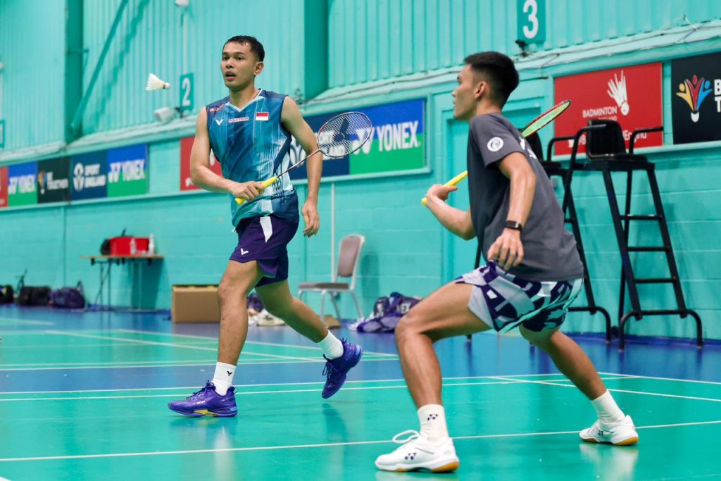 SATUJABAR, MILTON KEYNES INGGRIS – Pasangan Ganda putra Indonesia, Fajar Alfian/Muhammad Shohibul Fikri dan pasangan Inggris Ben Lane/Sean Vendy saling lempar pujian usai dua hari menjalani latihan bersama di National Badminton Centre, Milton Keynes, Inggris.