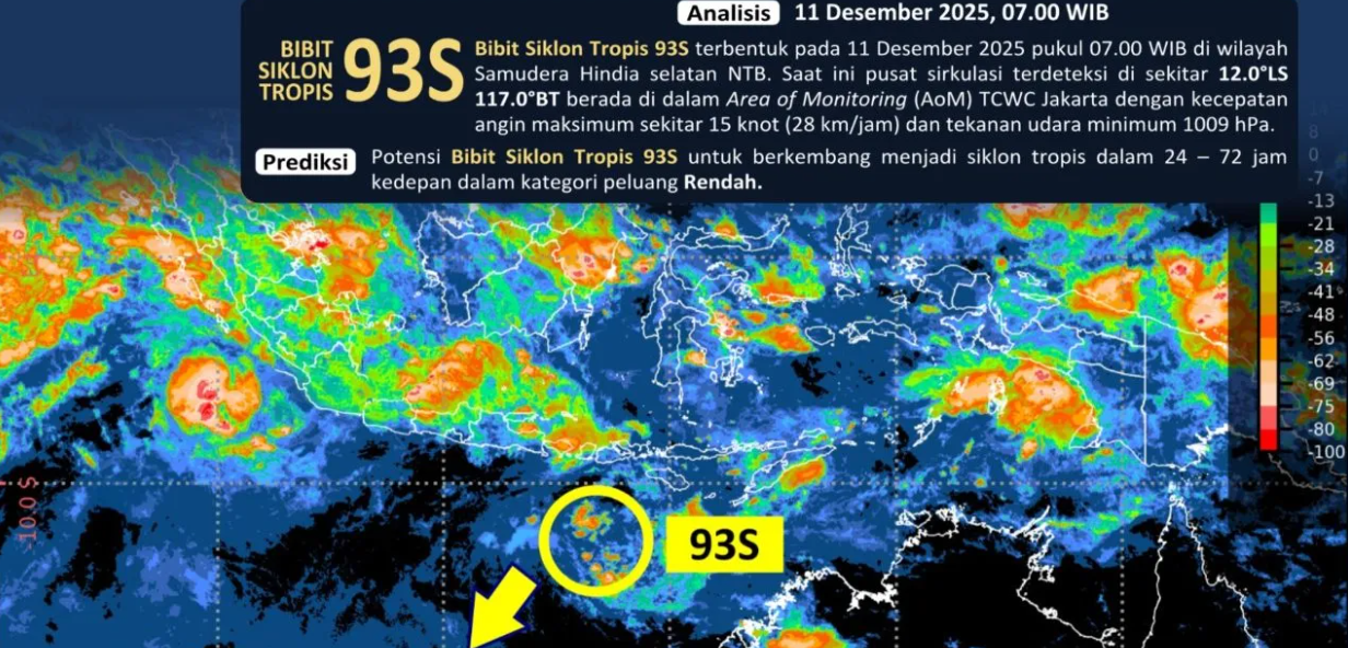 Sebelumnya, 93S mulai terbentuk pada 11 Desember 2025 pukul 07:00 WIB dengan pusat sirkulasi di sekitar 12.0°LS – 117.0°BT dan masuk ke dalam dalam Area of Monitoring (AoM) Tropical Cyclone Warning Centre (TCWC) Jakarta.
