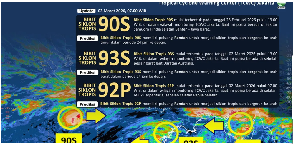 Kepala BMKG, Teuku Faisal Fathani, menjelaskan berdasarkan pantauan Tropical Cyclone Warning Center (TCWC) Jakarta hingga pukul 07.00 WIB, ketiga sistem yang saat ini aktif adalah Bibit Siklon Tropis 90S di Samudra Hindia selatan Banten–Jawa Barat, Bibit Siklon Tropis 93S di sebelah barat laut daratan Australia, serta Bibit Siklon Tropis 92P di Teluk Carpentaria sebelah selatan Papua Selatan.