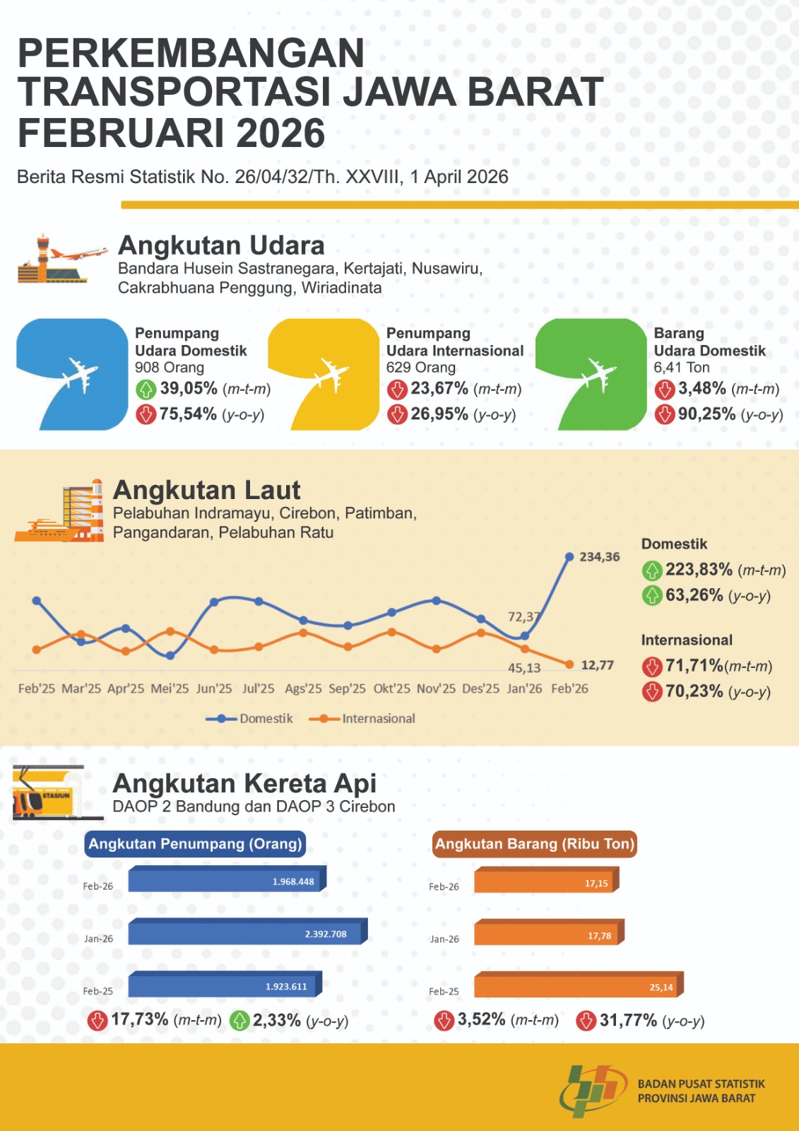 SATUJABAR, JAKARTA – Badan Pusat Statistik (BPS) Jawa Barat menyebutkan pada Februari 2026 volume penumpang angkutan udara domestik Jawa Barat naik sebesar 39,05 persen (m-to-m).