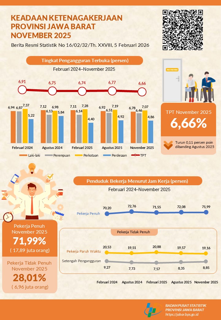 Menurut data itu, Tingkat Pengangguran Terbuka (TPT) November 2025 sebesar 6,66 persen, turun sebesar 0,11 persen poin dibandingkan dengan Agustus 2025 yang sebesar 6,77 persen.