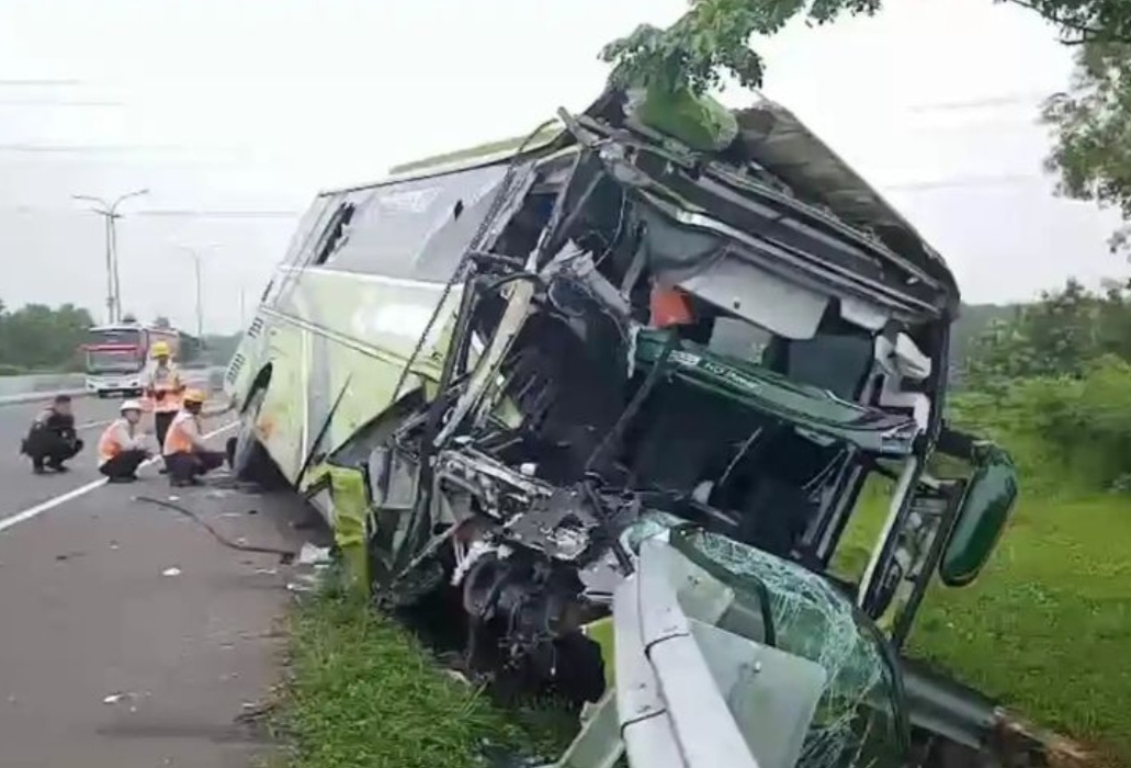 Kondisi bus pariwisata setelah menabrak truk dan menghantam pembatas jalan di Tol Cipali, Kabupaten Purwakarta.(Foto:Istimewa).