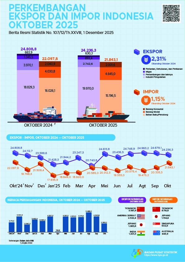 Sementara itu, pada Oktober 2025, ekspor mencapai US$24,24 miliar, turun 2,31 persen dibanding Oktober 2024. Ekspor nonmigas Oktober 2025 mencapai US$23,34 miliar, turun 0,51 persen dibanding Oktober 2024.