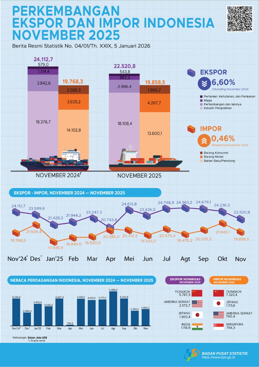 Sementara pada November 2025, ekspor mencapai US$22,52 miliar, turun 6,60 persen dibanding November 2024. Demikian juga dengan ekspor nonmigas November 2025 turun 5,09 persen menjadi US$21,64 miliar.