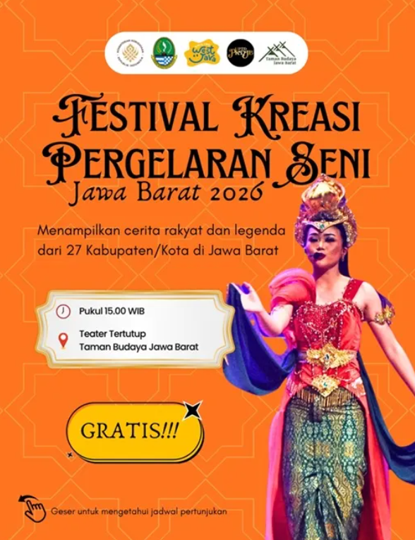 SATUJABAR, BANDUNG – Dinas Pariwisata dan Kebudayaan Provinsi Jawa Barat melalui UPTD Pengelolaan Kebudayaan Daerah Jawa Barat menggelar Festival Kreasi Pergelaran Seni Jawa Barat Tahun 2026. Kegiatan ini diadakan di Teater Tertutup Taman Budaya Jawa Barat, Kota Bandung, mulai 7 April sampai 24 November 2026.