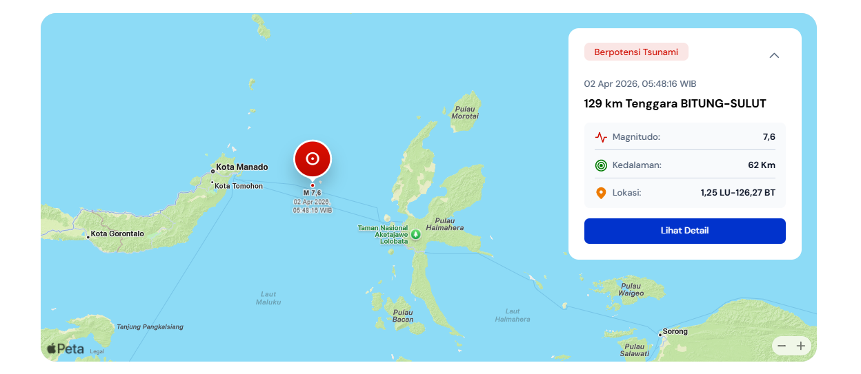 SATUJABAR, BANDUNG – Gempa bumi berkekuatan magnitudo 7,6 mengguncang Kawasan yang berada pada jarak 129 kilometer tenggara Bitung, Sulawesi Utara, pada Kamis (2/4/2026) pukul 05.48 WIB.