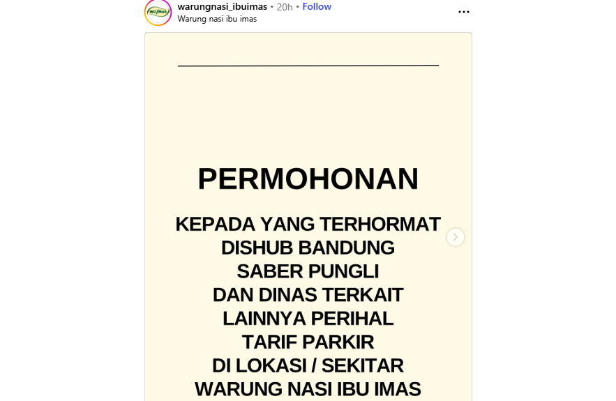 Seperti diungkapkan pada akun Instagram warungnasi_ibuimas yang bunyinya seperti ini.