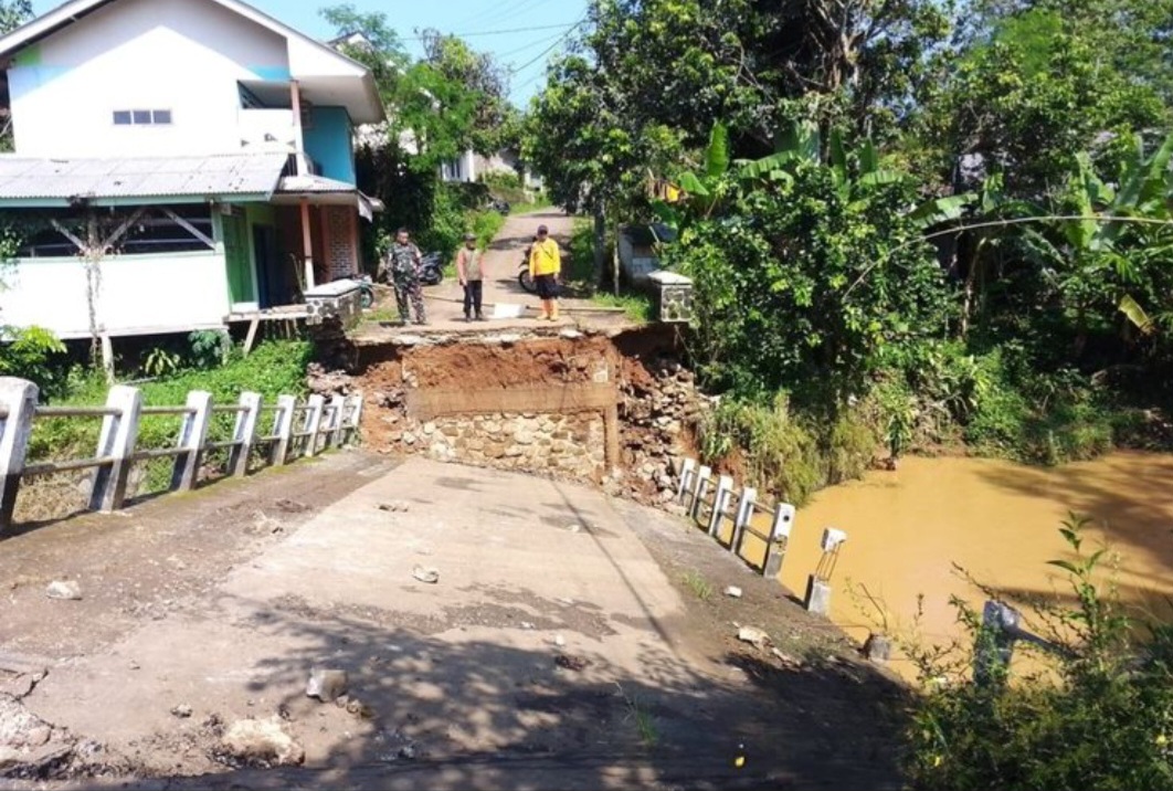 SATUJABAR, SUKABUMI–Hujan deras dan banjir luapan sungai, mengakibaembatan di Kabupaten Sukabumi, Jawa Barat, rusak. Akses penghubung dua desa, terputus.