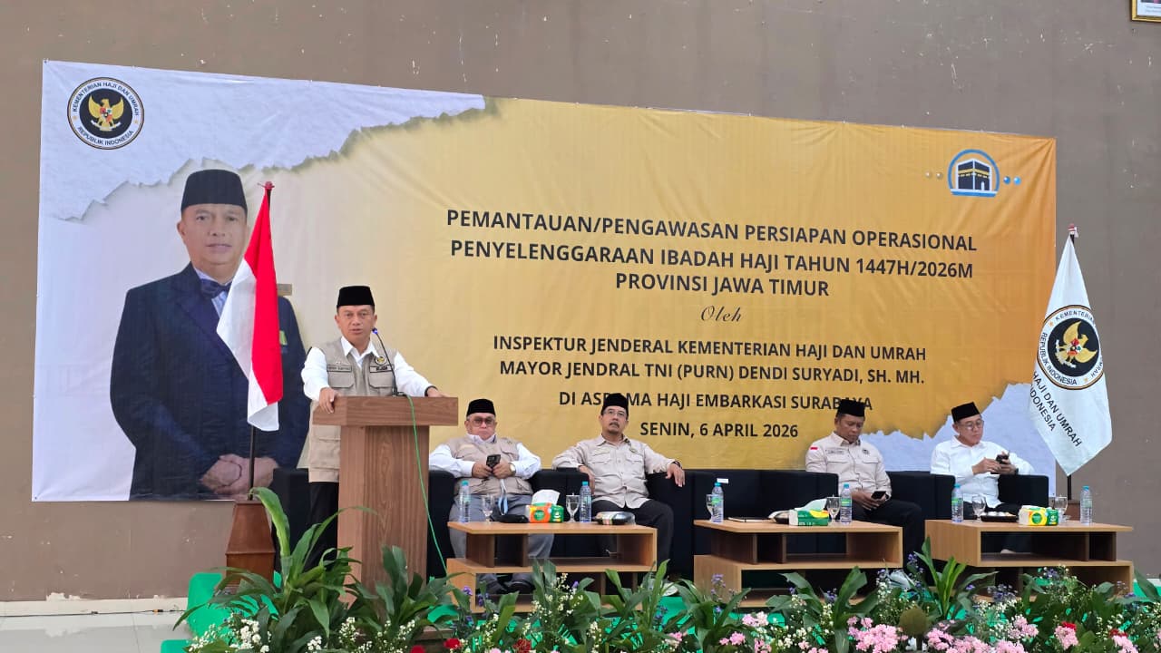 Hal tersebut disampaikanNYA saat memberikan arahan dalam kegiatan Pemantauan/Pengawasan Persiapan Operasional Penyelenggaraan Ibadah Haji Tahun 1447/2026M Provinsi Jawa Timur di Asrama Haji Kelas I Surabaya. (7/4/2026).