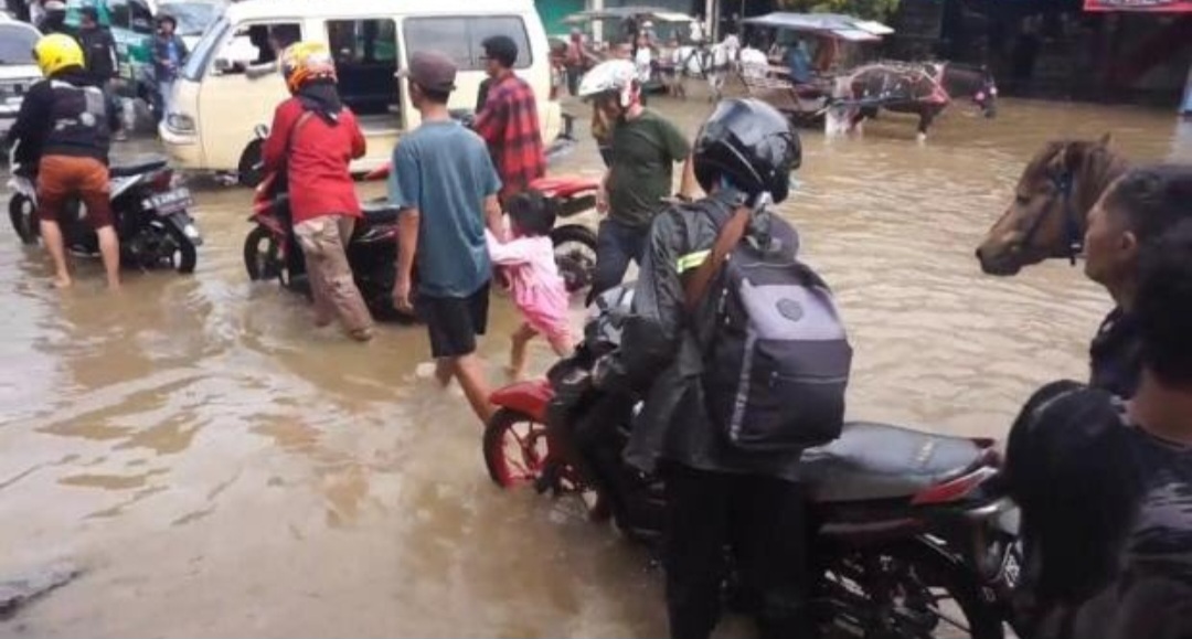 Kendaraan roda dua, atau sepeda motor, sulit melintas akibat genangan banjir. Hanya kendaraan roda dua yang bisa melewati bannir dengan berjalan pelan.