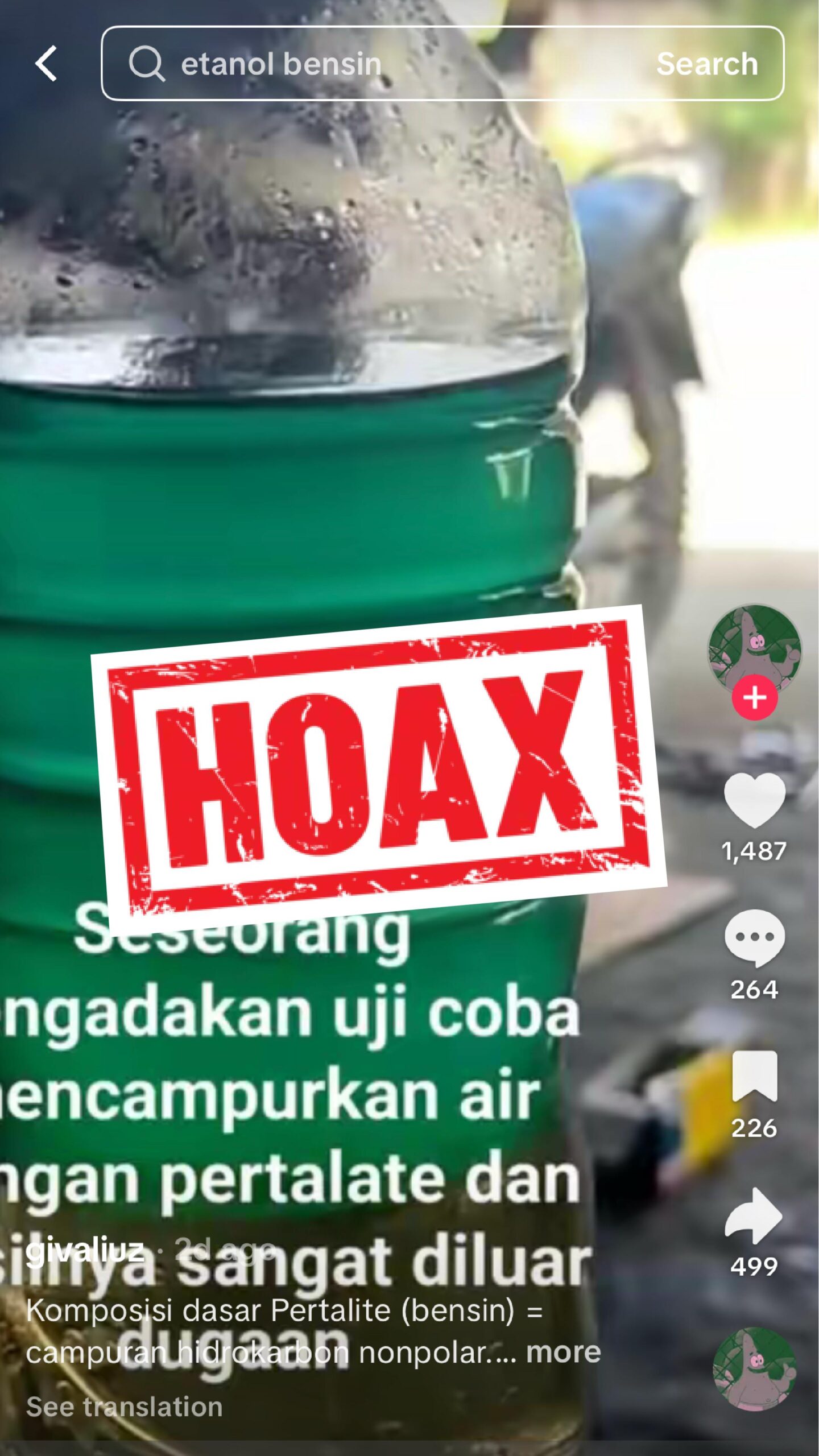 Pertamina Patra Niaga juga menyoroti adanya kesalahpahaman akibat percobaan mencampur Pertalite dengan air. Hasil percobaan yang menampilkan dua lapisan cairan tidak dapat dijadikan bukti adanya etanol. Secara ilmiah, bensin memang bersifat non-polar sehingga tidak dapat bercampur dengan air yang bersifat polar.