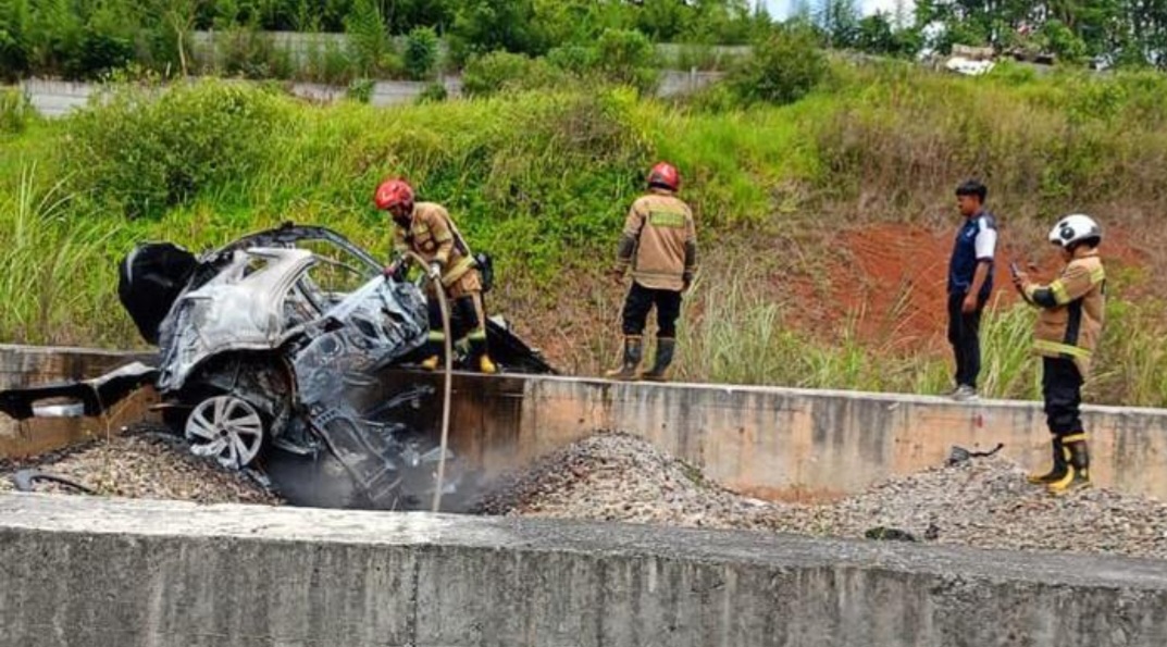 Bangkai mobil minibus Toyota Raize yang mengalami kecelakaan tunggal dan terbakar di Tol Cisumdawu, menewaskan mahasiswa Unpad.(Foto:Istimewa).