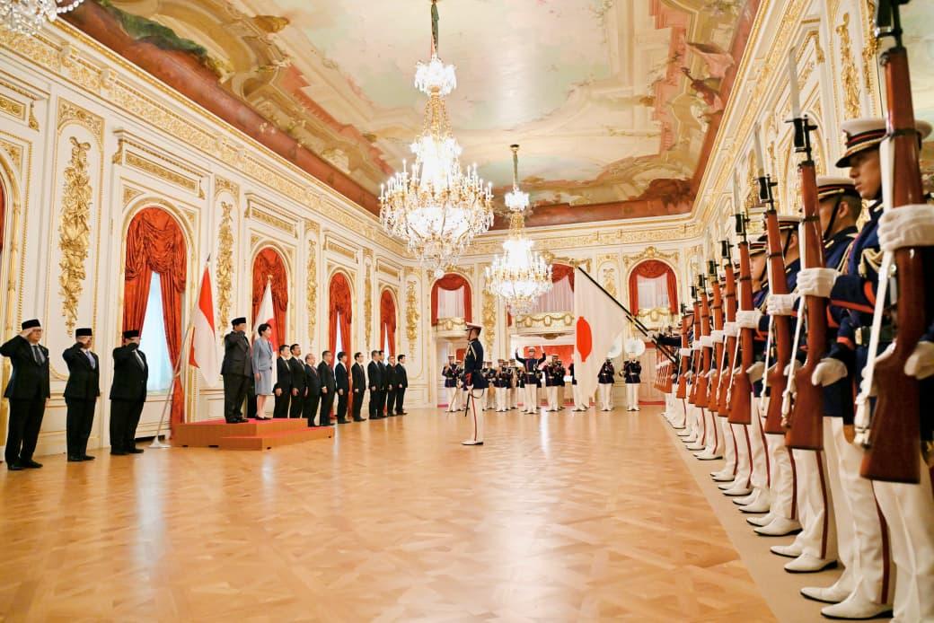 Di ruang Hagoromo-no-ma, seluruh delegasi resmi dari kedua negara telah berbaris rapi menyambut kedatangan kedua pemimpin. PM Takaichi selanjutnya mengarahkan Presiden Prabowo menuju mimbar kehormatan yang telah disiapkan.