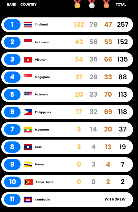 SATUJABAR, JAKARTA – Hingga hari keenam Minggu (14/12/2025), tuan rumah Thailand memimpin perolehan medali pada SEA Games 2025. Indonesia berada di posisi kedua dan Vietnam posisi ketiga.