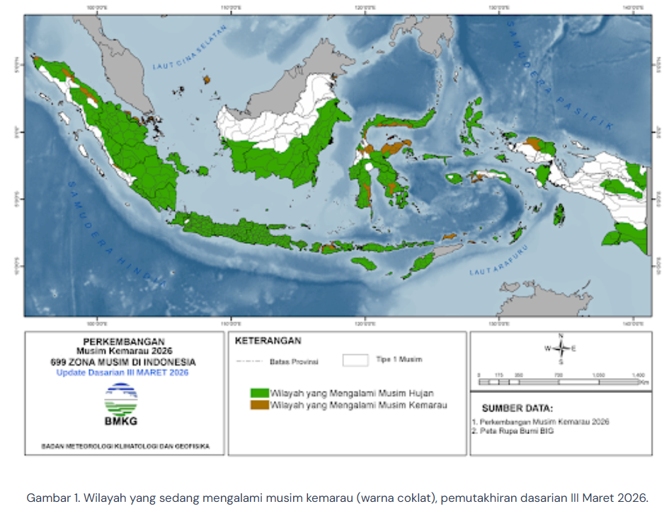 SATUJABAR, JAKARTA – Hingga akhir Maret 2026, sebanyak 7% Zona Musim (Z0M) di Indonesia telah memasuki musim kemarau, ungkap Badan Meteorologi, Klimatologi, dan Geofisika (BMKG).